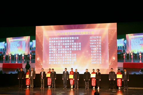 会上,公司以优异成绩荣获2016年度“湖州开发区税收贡献前十强、重大技术改造奖、科技创新奖、品牌建设先进奖、外贸贡献奖”等五项大奖,公司董事长、总经理高兴江先生作主题为“顺应时代趋势、创新驱动发展”的交流发言。